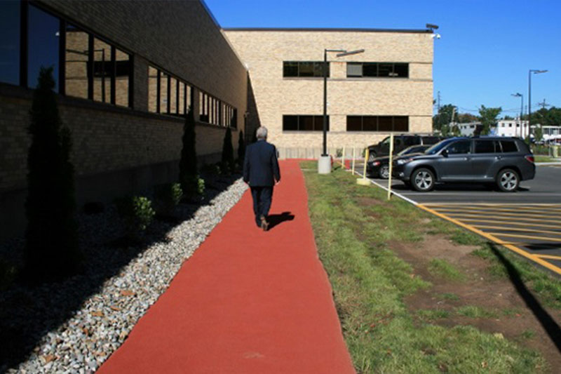 Aleile din cauciuc, trotuarele și căile de acces sunt adesea montate în cazul construcțiilor civile și industriale furnizând un spațiu exterior sigur și confortabil. Pavelele de cauciuc sunt adesea folosite în proiecte de înfrumusețare urbană, o alternativă modernă și durabilă.